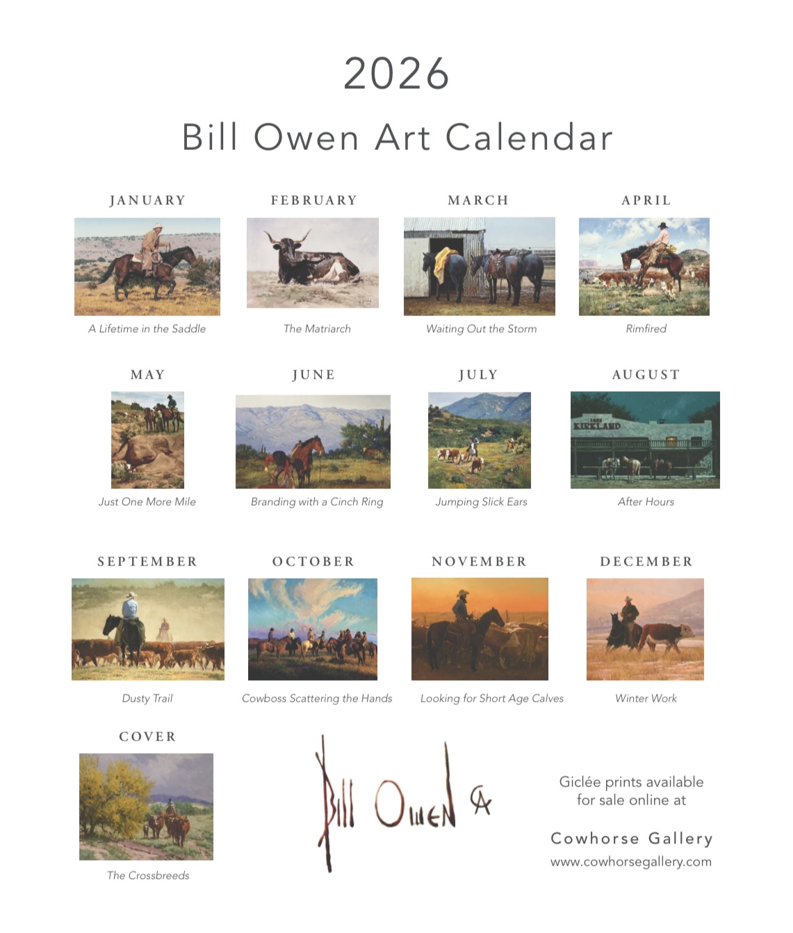 2026 Bill Owen art calendar. Featuring twelve of our favorite Bill Owen works. Limited quantities, order today!